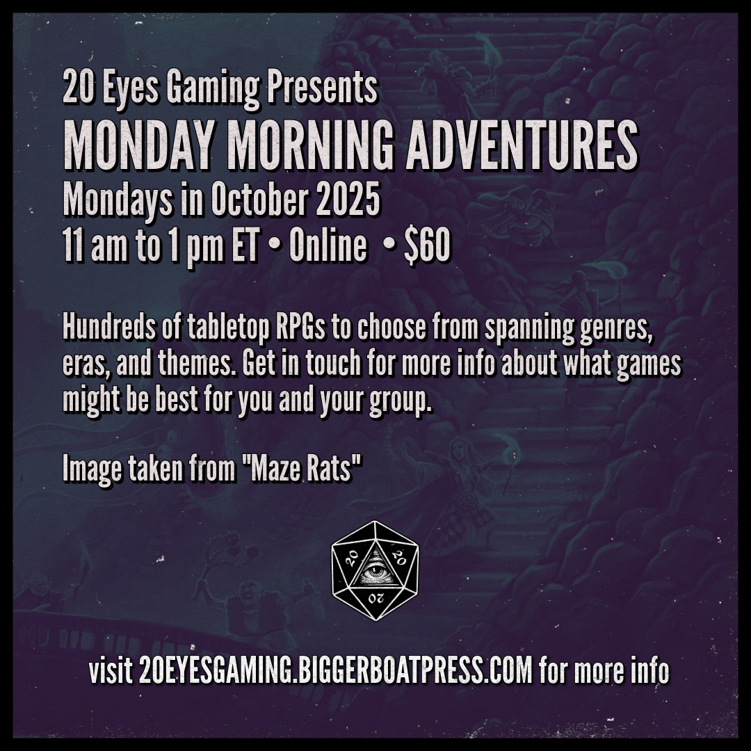 Hello! My name is James Rosario and I’ve been playing tabletop RPGs for 30 years. I love the art and process of collaborative storytelling and want to share my knowledge and experience with you and yours. 20 EYES GAMING offers exciting and immersive tabletop gaming experiences with a knowledgeable and skilled game master. Each player in every game will have a chance to be a hero – or die trying.