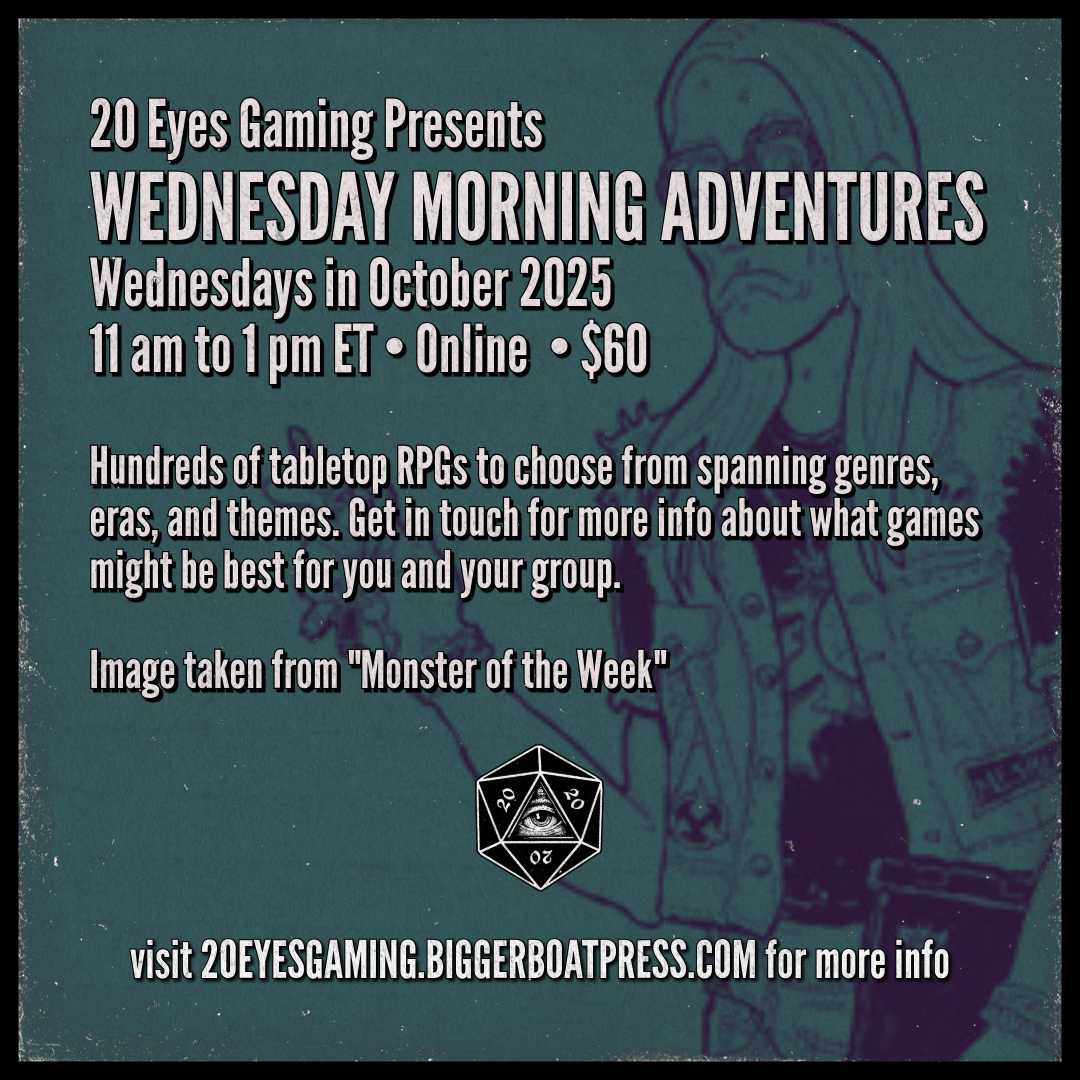 IMPORTANT! NO EXPERIENCE NECESSARY! Part of a good game master’s job is teaching new players how a game works and how to have the most fun while playing. We all had to start somewhere. My games require as much or as little experience as you currently have at this moment, with the hopes that after each session players will walk away feeling enriched, confident, and ready for what life throws at them.